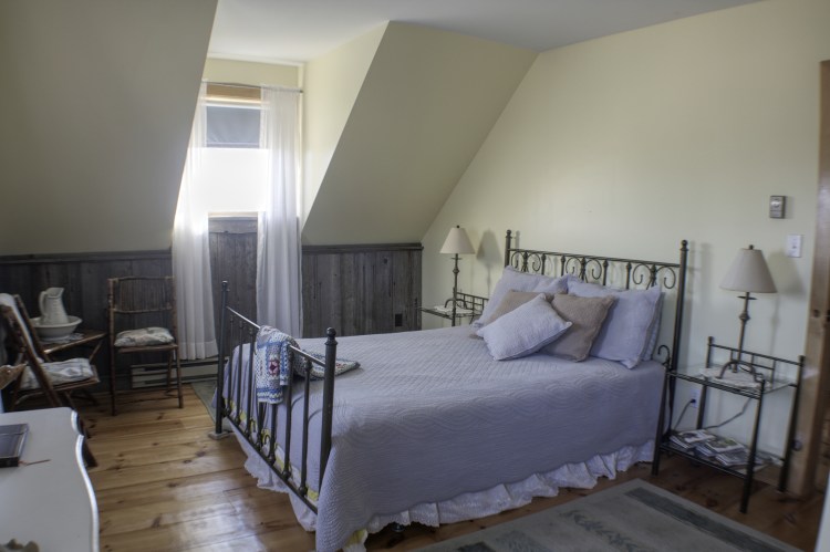 Cette deuxième chambre, la plus spacieuse, offre un cachet unique avec son revêtement mural en bois de grange original. Son parquet miel doré, ses fenêtres donnant sur le lever du soleil et vue sur l’abbaye Saint-Benoît-du-Lac avec, comme toile de fond, le lac Memphrémagog et le mont Owl’s Head.